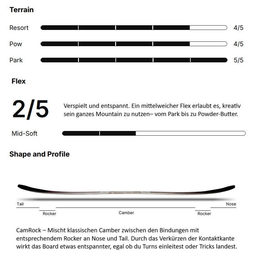 Das Sensor ist ein für den Park optimiertes Deck, das mit Technik vollgepackt ist, um überall auf dem Hügel für Spaß zu sorgen. Seine true twin-Form ist ideal für Switch-Starts und Landungen, aber wir haben genug Volumen im Nose und Tail gelassen, damit es im Powder gut floatet, wenn du es richtig krachen lassen willst. Das CamRock-Profil und SideKick-Spitzen, die die Kanten anheben, fördern das Lernen – flache Landungen, Butter, Rail-Lines und ausgedrehte Spins sind die Happy Places dieses Boards.