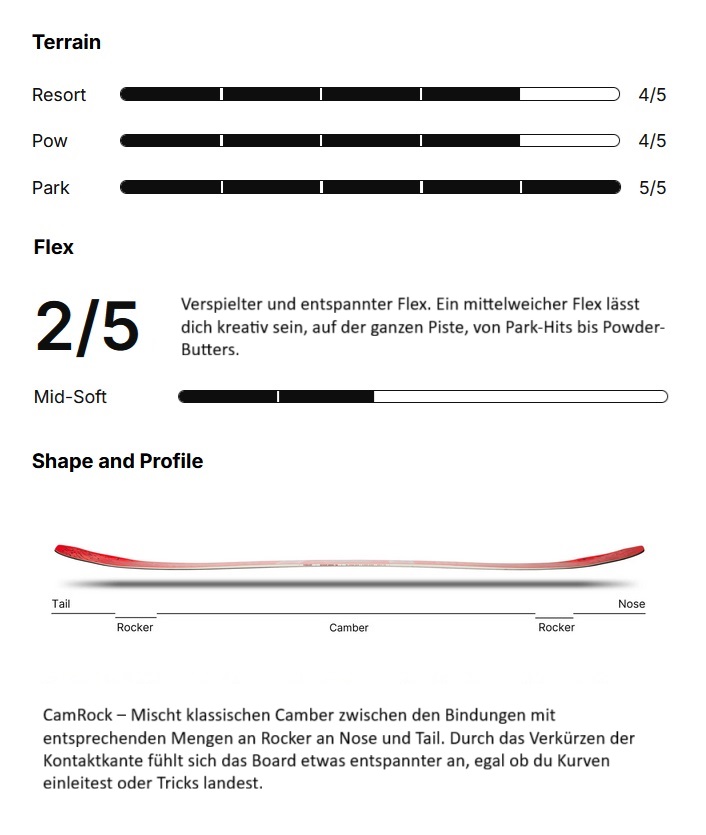 Der Sensor ist ein park-tuned Deck, das mit viel Technik ausgestattet ist, um überall auf der Piste für Spaß zu sorgen. Sein True Twin-Design ist perfekt für Switch-Starts und Landungen, aber wir haben genügend Volumen im Nose und Tail beibehalten, damit es im Powder gut floatet, falls du richtig loslegen willst. Ein CamRock-Profil und SideKick-Spitzen, die die Kanten anheben, fördern das Fortschreiten – Flatland-Butters, Rails und ausgefallene Spins sind der Lieblingsplatz dieses Boards.