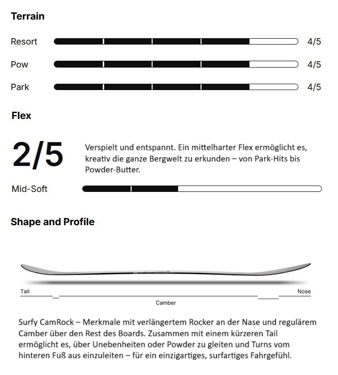 - Unser Surfy CamRock-Profil ist zwischen den Füßen federnt, erweitert aber den Nose-Rocker, um dem Alpha zu helfen, Unebenheiten zu überwinden und tiefen Schnee mühelos zu durchqueren.
