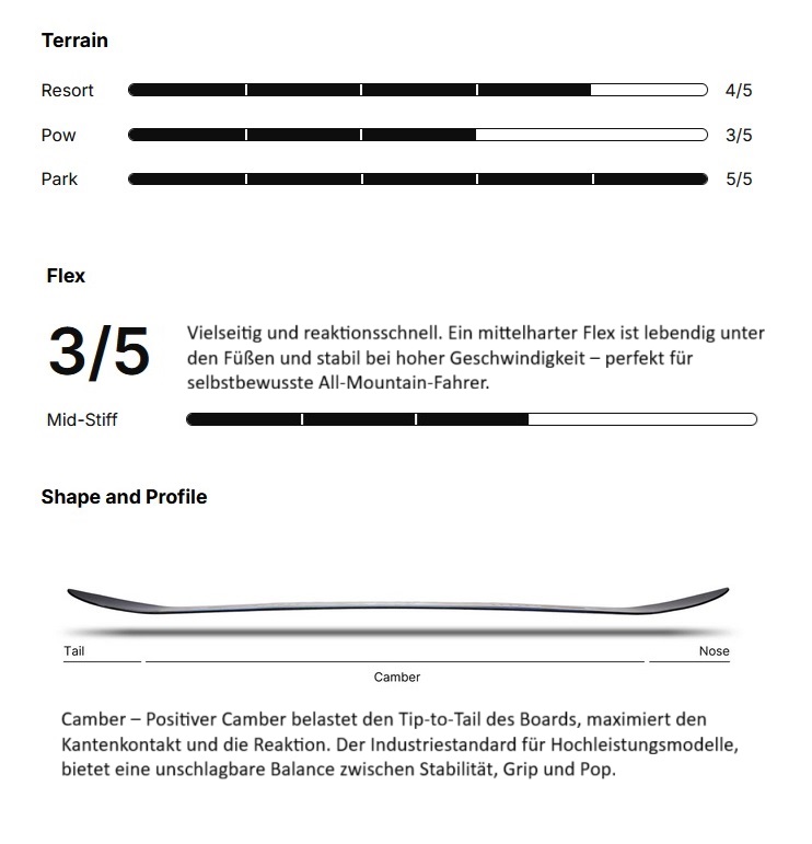- Das 3D Evolution Nose und Tail hat eine Löffelform, die den Kurveneinstieg glättet und das Board durch Tiefschnee, Schneematsch und Schneematsch gleiten lässt.